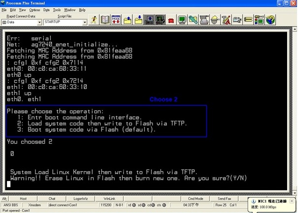 2.      Open the terminal console program, boot up N2 PCBA & press 2