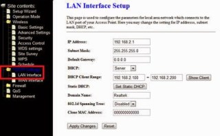 TCP/IP Settings -> LAN Interface (default IP address is 192.168.2.1)