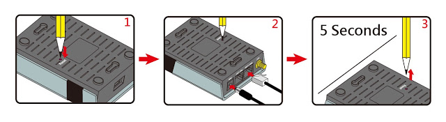 7. Push the reset button and plug in power source and ethernet cable and wait for 5 seconds to release the reset button