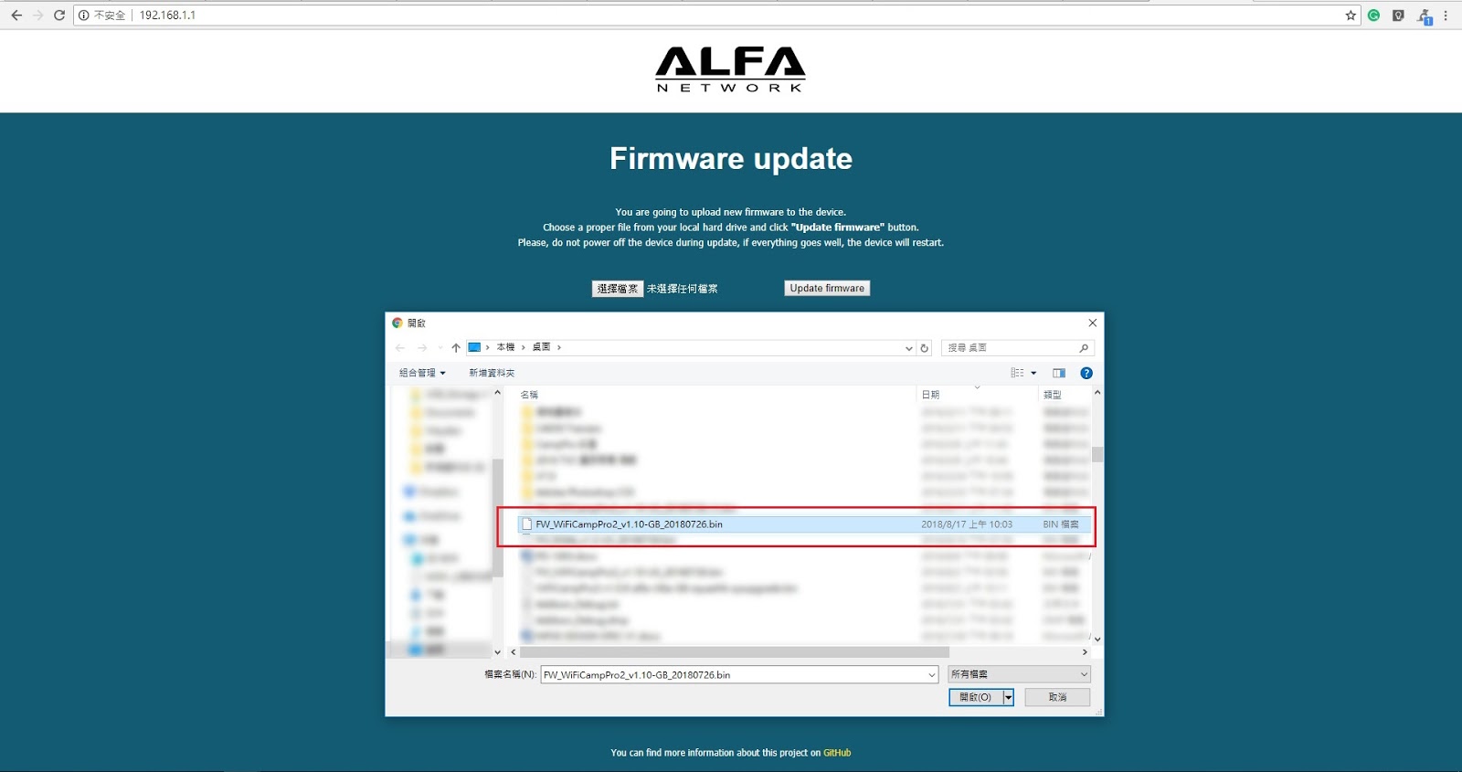 9. Use “Browse” button to choose the right firmware then click “Update firmware” button and wait about 3 minutes until device fully upload and reboot